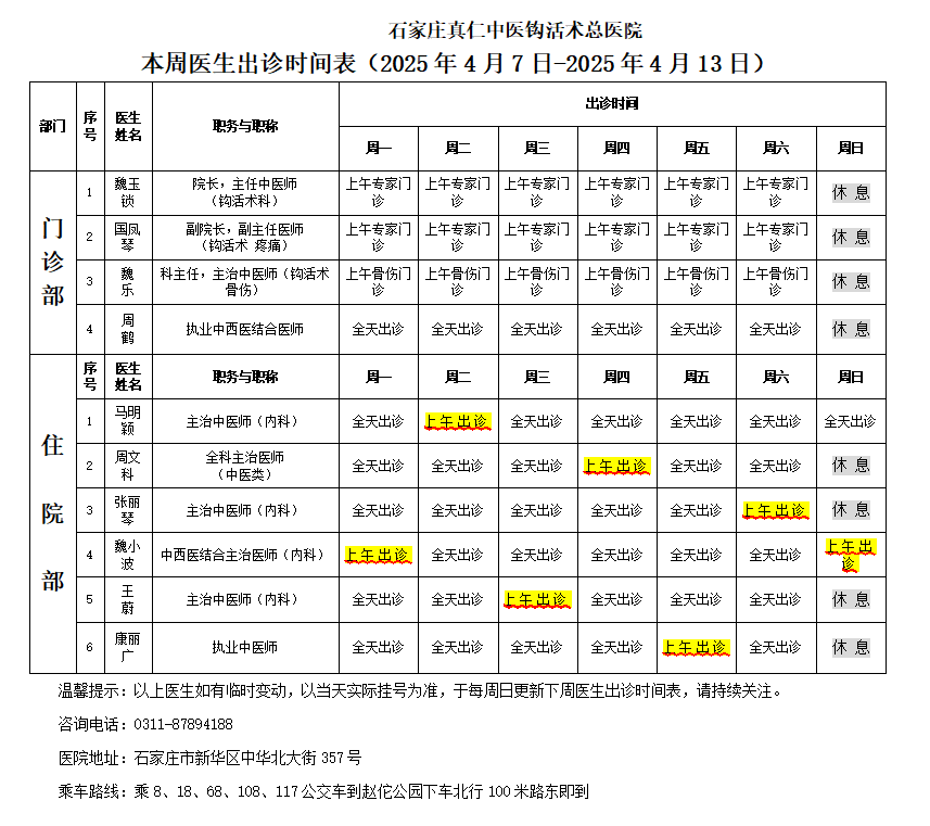 出诊时间表(2025.4.7-4.13)